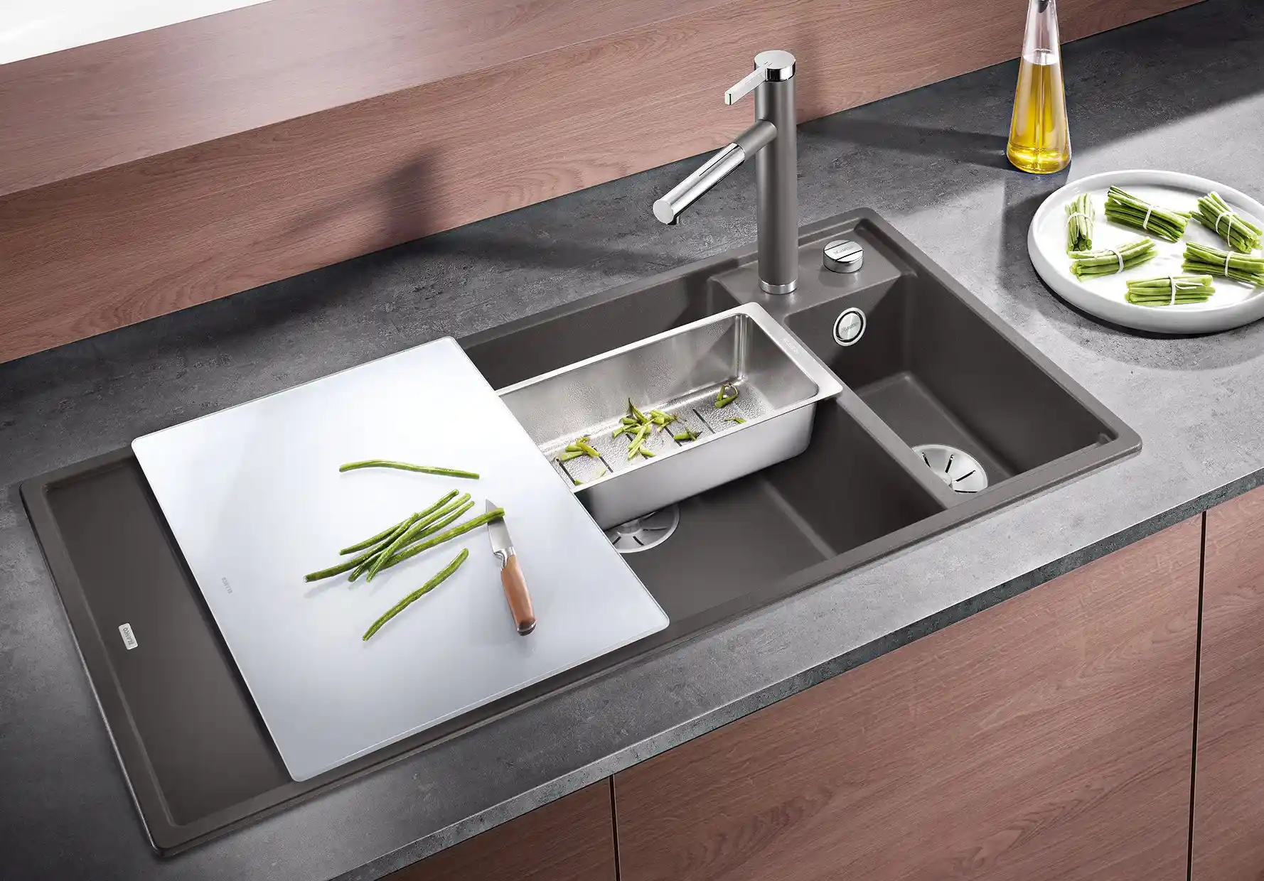- Inclusief verschuifbare snijplanken