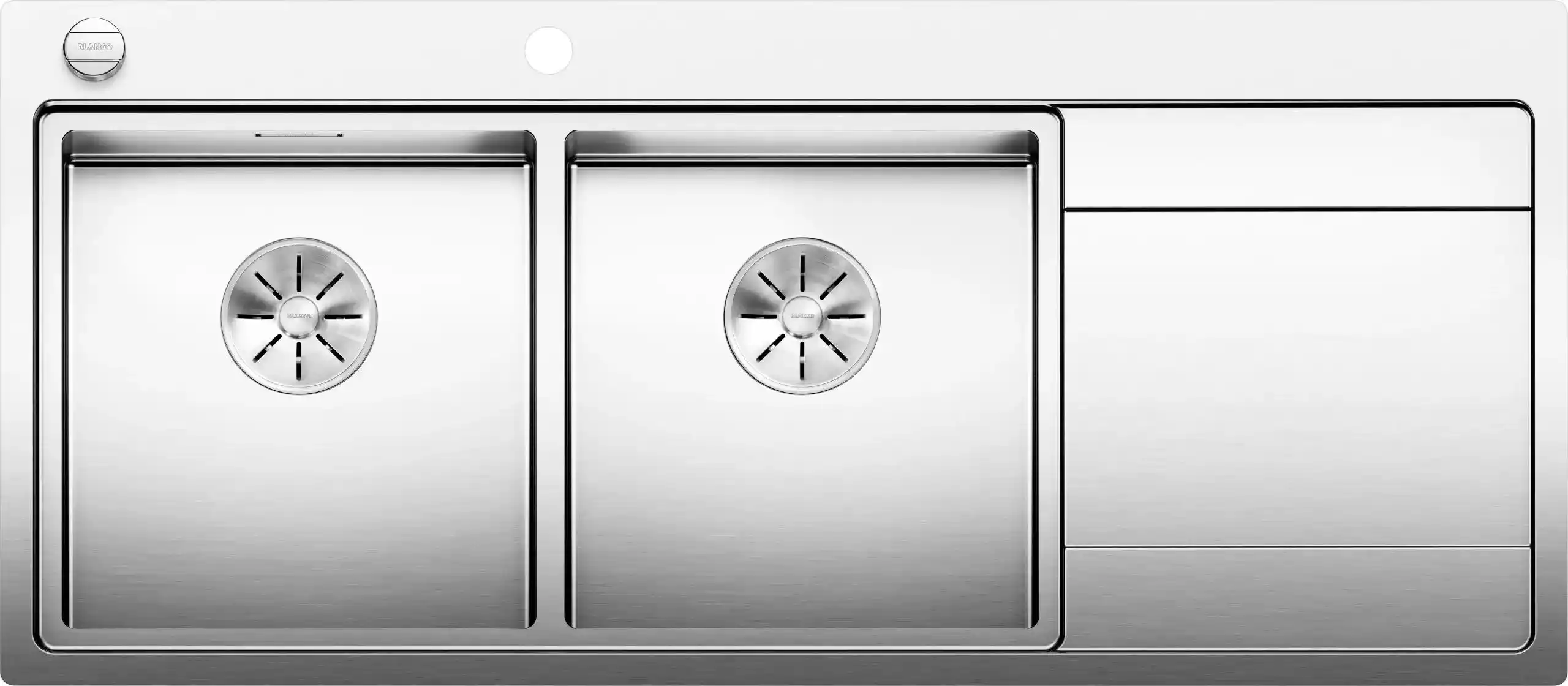 Deze Blanco Divon II 8 S-IF 521664 dubbele keukenspoelbak links RVS is geschikt voor zowel opbouw als vlakbouw installatie. Het materiaal is poriënvrij, hygiënisch en bijzonder robuust, en blijft permanent roestvrij dankzij het gebruik van roestvrij staal. De onderhoudsvriendelijke oppervlakte heeft een zelfherstellende passieve laag en is hittebestendig tot 300 °C. De spoelbak is voorzien van een verborgen overloop, C-overflow®, en heeft twee voorgeboorde gaten, in het midden en links. Het afvoersysteem, InFino®, is in elke functionele toestand vlak geïntegreerd. De spoelbak is eenvoudig te reinigen, omdat er nauwelijks randen en voegen aanwezig zijn, en kan gemakkelijk in twee componenten worden gedemonteerd voor reiniging. De set wordt geleverd inclusief af- en overloopgarnituur met afvoerbediening, die wordt bestuurd via een draaiknop.