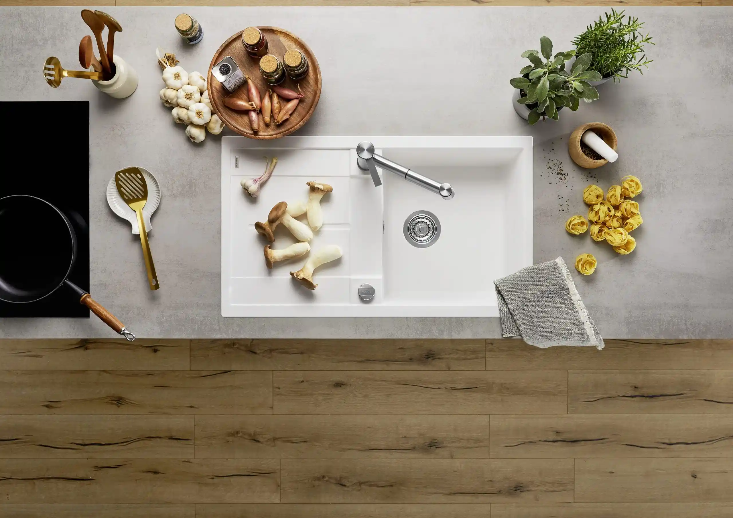 Blanco specialiseert zich in alles wat met de waterzone van de keuken te maken heeft en biedt complete, goed doordachte oplossingen voor thuisgebruik. Het merk staat bekend om zijn perfect op elkaar afgestemde systemen die zowel functioneel als visueel samenkomen. Denk hierbij aan spoelbakken, kwalitatieve kranen, systemen voor koolzuurhoudend en gefilterd water, koeling en een breed scala aan accessoires — van zeepdispensers tot slimme opbergoplossingen voor afval en onderkasten. Dankzij het uitgebreide aanbod in functies, stijlen, kleuren en materialen kunnen keukenprofessionals creatief aan de slag, terwijl consumenten volop keuze hebben om hun keuken volledig naar eigen wens in te richten.*Geschatte leverdatum