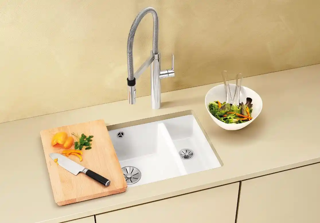Deze Blanco Subline 350/150-U 523747 anderhalve keukenspoelbak is ontworpen voor onderbouwinstallatie en kan worden gecombineerd met een standaardkraan voor montage op het werkblad. De spoelbak is vervaardigd uit minerale materialen en heeft een bijzonder onderhoudsvriendelijk en krasbestendig oppervlak van keramiek. Dankzij de vuilafstotende PuraPlus®-oppervlakte is de spoelbak eenvoudig schoon te maken. De spoelbak is snijbestendig, met uitzondering van keramische messen, en hittebestendig tot 280 °C. De afmetingen van de kleinere bak zijn 15 x 39,6 cm met een diepte van 13 cm. Het InFino®-afvoersysteem is in elke functionele toestand vlak ingebouwd, wat bijdraagt aan de eenvoudige reiniging doordat er nauwelijks randen en voegen aanwezig zijn. Het systeem is gemakkelijk in twee componenten te demonteren voor reiniging en biedt een uniek bedieningsgemak door intuïtief draaien.