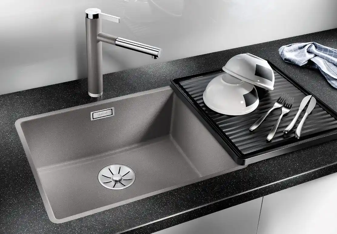 Deze Blanco Subline 500-F 527352 enkele keukenspoelbak in Silgranit vulkaangrijs is ontworpen voor zowel onderbouw- als vlakbouwinstallatie. Het product is compatibel met standaardkranen voor montage op het werkblad. Het materiaal is krasbestendig en bestaat tot wel 80% uit natuurlijk graniet, bekend als SILGRANIT® PuraDur®. De antibacteriële en onderhoudsvriendelijke oppervlakte vermindert de groei van bacteriën met maximaal 98%, dankzij de Hygiene+Plus technologie. De spoelbak is hittebestendig tot 280 °C. Het bevat een verborgen overloopsysteem, C-overflow®, en het InFino® afvoersysteem. In elke functionele toestand blijft de spoelbak vlak. De spoelbak is eenvoudig te reinigen, omdat er nauwelijks randen en voegen aanwezig zijn. Voor reiniging kan het gemakkelijk in twee componenten worden gedemonteerd. Het biedt een uniek bedieningsgemak door intuïtief draaien.