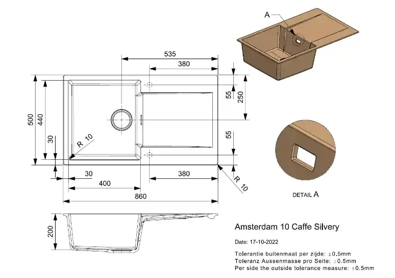 - Productnaam: Reginox Amsterdam 10 Caffe Silvery R30943 Enkele Keukenspoelbak Graniet Omkeerbaar Opbouw