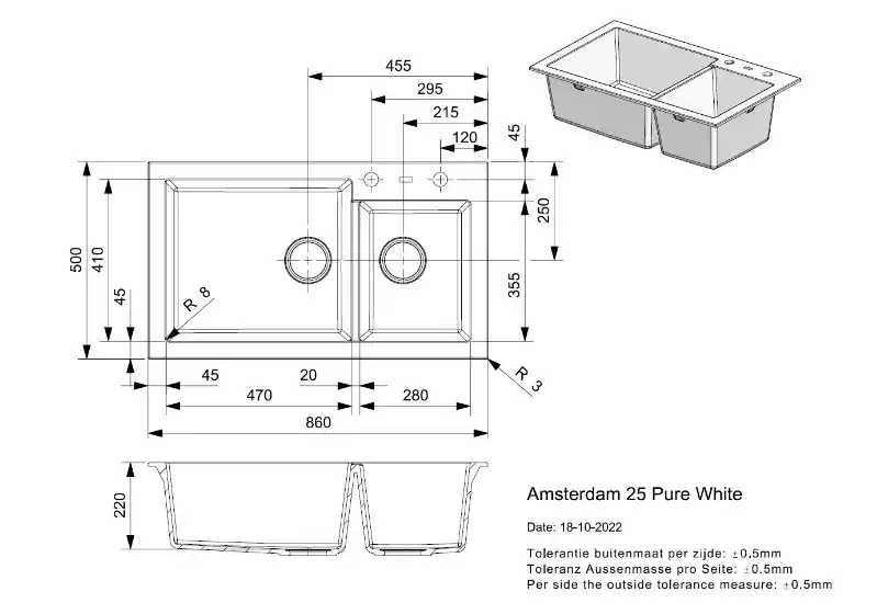 Deze Reginox Amsterdam 25 Pure White R31070 is ontworpen voor installatie van bovenaf en biedt een extra compartiment met een breedte van 28 cm en een diepte van 35,5 cm. De binnenste diepte van de spoelbak is 22 cm. Het product beschikt over twee voorgeboorde gaten. Het wordt geleverd met zeefkorfventielen en een af- en overloopgarnituur dat handmatig bediend kan worden door te drukken of te trekken aan het afvoermechanisme. Bevestigingsklemmen zijn inbegrepen voor eenvoudige installatie. De spoelbak is vervaardigd uit minerale materialen en heeft een bijzonder onderhoudsvriendelijk en antibacterieel oppervlak, bekend als Regi-Granit.
