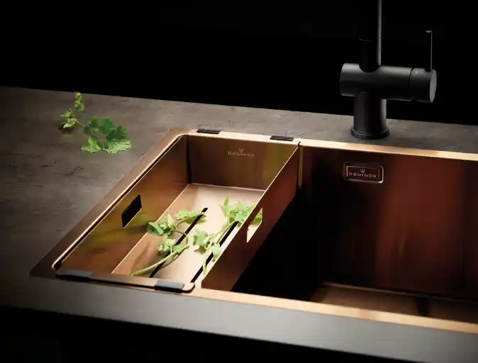 Deze Reginox Miami Inzetbak RVS Copper R30554 is vervaardigd uit hoogwaardig roestvrij staal, wat zorgt voor duurzaamheid en een lange levensduur. Het materiaal is bestand tegen corrosie en biedt een uitstekende weerstand tegen dagelijkse slijtage. De inzetbak heeft een stijlvolle koperen afwerking die een moderne en elegante uitstraling aan elke keuken toevoegt. Met zijn precieze afmetingen past deze inzetbak perfect in verschillende keukenopstellingen, waardoor hij veelzijdig inzetbaar is. De strakke lijnen en het functionele ontwerp maken het een praktische keuze voor zowel traditionele als moderne keukens. Deze inzetbak is eenvoudig te reinigen en te onderhouden, wat bijdraagt aan het gebruiksgemak en de hygiëne in de keuken.
