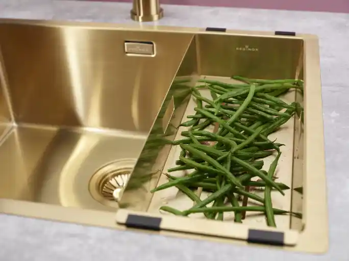 Deze Reginox Miami Inzetbak RVS Goud R30561 is vervaardigd uit hoogwaardig roestvrij staal, wat zorgt voor duurzaamheid en een lange levensduur. Het materiaal is bestand tegen corrosie en biedt een uitstekende weerstand tegen dagelijkse slijtage. De gouden afwerking geeft een elegante en moderne uitstraling, waardoor het een stijlvolle toevoeging is aan elke keuken. Deze inzetbak is ontworpen met precisie en biedt een naadloze integratie in uw werkblad. De afmetingen zijn zorgvuldig gekozen om een optimale functionaliteit te garanderen, terwijl het ontwerp zorgt voor een efficiënte waterafvoer. Dit product is ideaal voor wie op zoek is naar een combinatie van esthetiek en functionaliteit in de keuken.