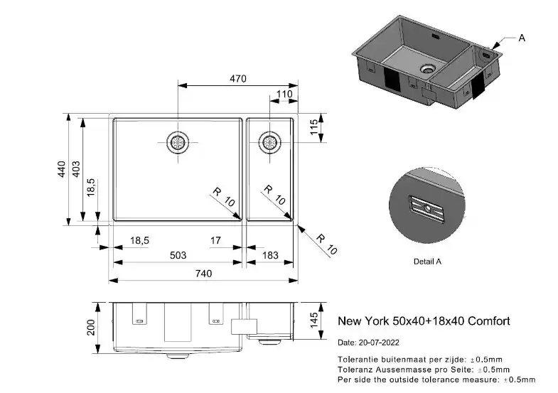 Deze Reginox New York 50 x 40 + 18 x 40 OKGD Comfort R27837 is een anderhalve keukenspoelbak die links geplaatst kan worden en is vervaardigd uit hoogwaardig roestvrij staal. Deze spoelbak is geschikt voor zowel opbouw, onderbouw als vlakbouw installatie. Het beschikt over een restbak met een breedte van 18,3 cm en een diepte van 40,3 cm, met een inwendige diepte van 14,5 cm. De spoelbak kan gecombineerd worden met een standaard kraan voor montage op het werkblad. Het wordt geleverd inclusief zeefkorfventielen en een af- en overloopgarnituur met handmatige bediening door middel van drukken of trekken aan het afvoerventiel. Ook zijn bevestigingsklemmen inbegrepen. Het materiaal is poriënvrij, hygiënisch en bijzonder robuust, en blijft permanent roestvrij dankzij het gebruik van edelstaal.